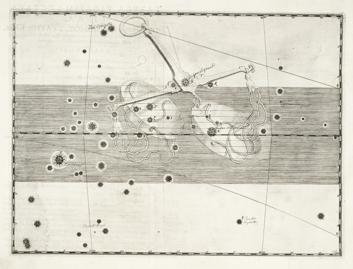 En cuanto a la Balanza (Fig. 6), al parecer, se asocia con la diosa griega Temis, encargada de la justicia, que se la representaba con este utensilio. Anteriormente esta constelación fue parte del Escorpión (concretamente sus pinzas) pero se "independizó" en época de la Roma antigua. Los antiguos creían que el Escorpión visitaba a menudo esta constelación por lo que las dos estrellas más brillantes se llaman Zuben Elgenubi (la pinza austral... del escorpión) y Zuben Elschemali (la pinza boreal).
