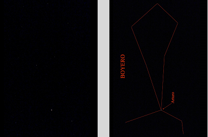 Tracemos una línea imaginaria con las estrellas de la "lanza del Carro" y llegaremos hasta Arturo (Fig.4 estrella "B"), la más importante de la constelación del Boyero (Boötes).