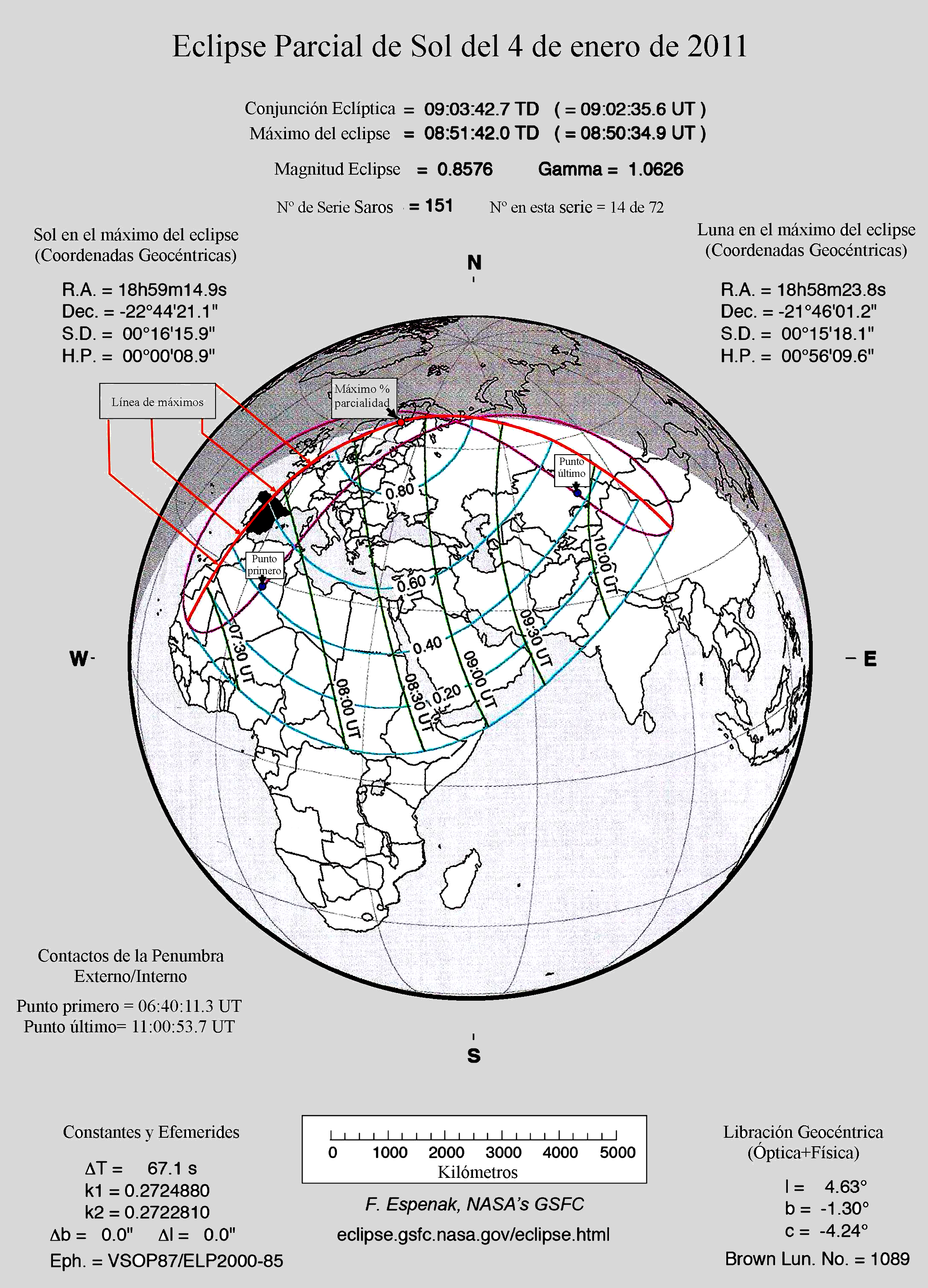 El primer eclipse solar de 2011 (Fig.3) tendrá lugar con el nodo ascendente de la Luna al este de Sagitario. Se verá como un eclipse parcial en casi toda Europa, Norte de África y Asia Central. En concreto, para nuestra zona geográfica, tenemos los siguientes datos: (Fig.4)